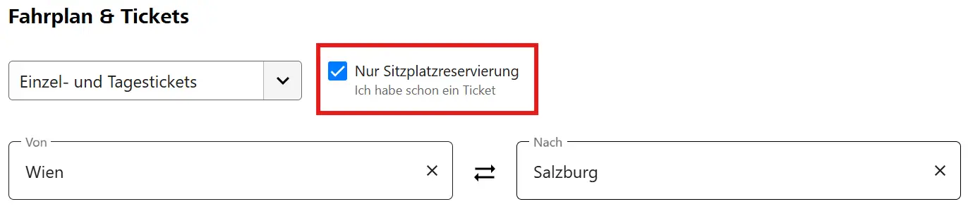 Auf der ÖBB Website muss zum Buchen einer Reservierung die Option:“Nur Sitzplatzreservierung - Ich habe schon ein Ticket”ausgewählt werden.